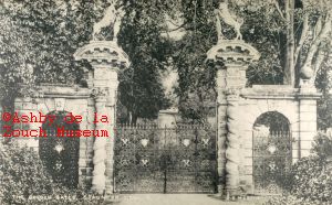 The Golden Gates, entrance to Staunton Harold hall, with Trinity church on left. Possibly in early 1900's