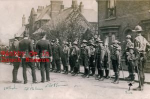 Parade outside Cottage hospital. Miltary and Boy Scouts