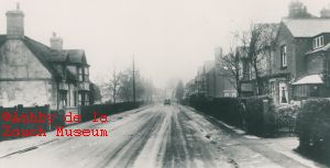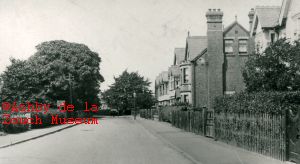 Leicester Road in probably the 1930's, with site of Grammar School on left, and Cottage hospital on right, out of sight, at end of terrace of houses. House with chimney built 1900 and adjacent houses in the 1920's.