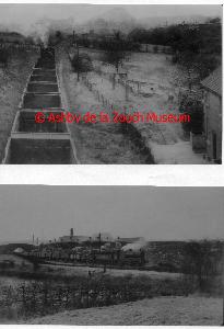Newbold pipeworks: Pre 1928. Train travelling towards New Lount colliery - see spoil heaps in distance. Colliery opened in 1924, closed in 1968. Second photo shows Newbold pipeworks behind the train.