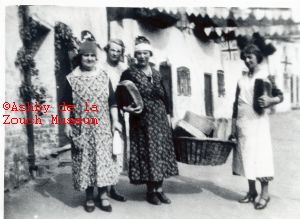 George VI with lady residents with basket of bread loaves -