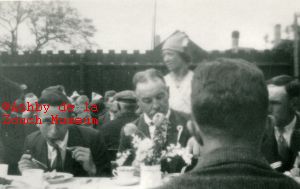 Edward VII or George V with residents standing around.