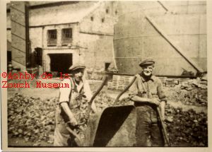 Gas works. Workers shoveling coke. Date unknown, but possibly