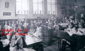 children sitting at desks. Room is now the library and TIC.
