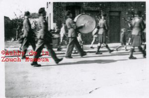 P09-0517). Marchers with bagpipes and kilts. Children in short