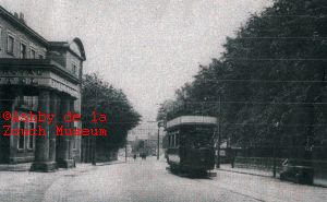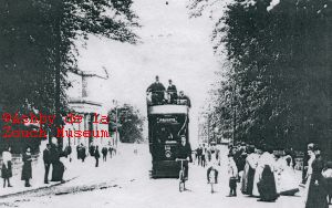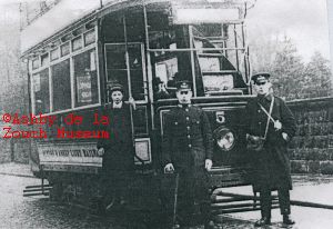 Tram outside Royal Hotel -preceded by boy on bike! Note sign