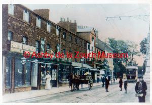 (greengrocer). Note tram and horsedrawn cart. Loudoun memorial