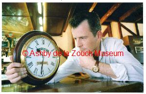 28th November 1995. No.41 Old George Inn (now a betting shop), Seamus Byrne, pub manager with the clock which keeps fallingof the wall.