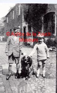 showing two children with a dog and elderly gentleman with young