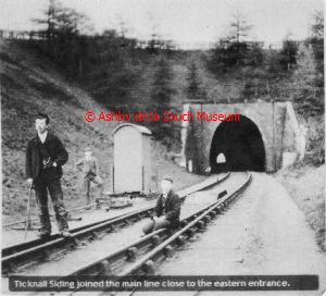 View of Old Parks tunnel, Ashby, showing the Groony Frame which controls the switch into the Ticknall Sidings. Date around 1930. Man and boy lived in the Tunnel house (Chadwick & sons). Second photo shows the Ticknall Tunnel house in 1951. the tramway passed through the gate on the right towards Ticknall. There was weighbridge at this point. Tunnel in use until approx 1925-30. Man and boy lived in the Tunnel house .
