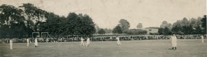 View of game in progress, Leicestershire County cricket team on the Bath Grounds.