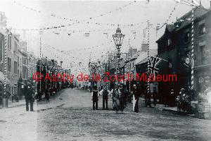 Street decorated for coronation of Edward VII. Businesses