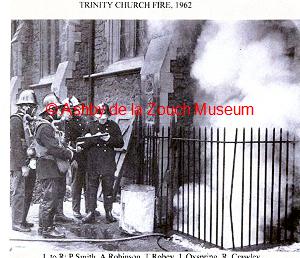 Kilwardby Street. Holy Trinity church - the fire in 1962. Firemen in attendance - L to R: P.Smith, A. Robinson, T. Robey, J. Oxspring, R. Crawley.