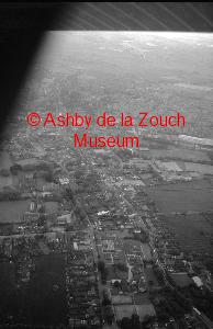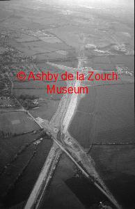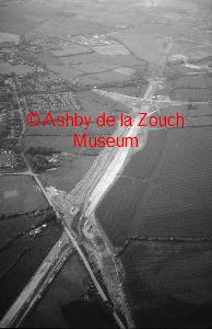 Aerial view of Ashby in 1988. Line of the A42 under construction, running top to bottom (south to north). The bridge in centre is over Upper Packington Road. The Railway line runs across just above.