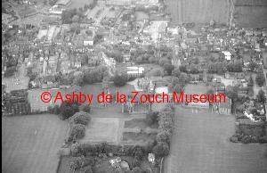 Aerial view of Ashby in 1988. Castle in foreground. Manor House school and grounds behind, and St. Helen's church.