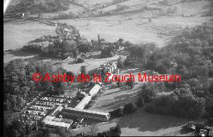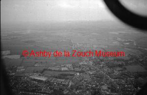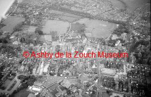 Aerial view of Ashby in 1988. Foreground is Smisby Road with the soap factory buildings and Hood Park adjacent. Market Street runs diagonally across the photo.