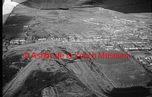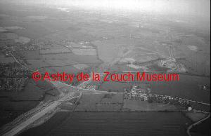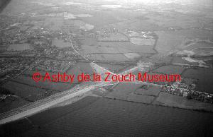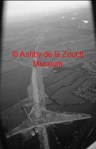 Aerial view of Ashby in 1988. Line of the A42 under construction, running left to right (south to north) diagonally. The Railway line runs across middle view. Leicester Road (then the A50, now the A511) runs bottom right (buildings are New Packington) to top left. Town of Ashby to the left.