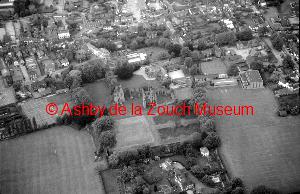 Aerial view of Ashby in 1988. Castle in foreground. Manor House school and grounds behind, and St. Helen's church.