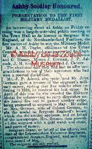 Notice of presentation in 1916 to the winner of the Military Medal to Sgt. Wm England, a native of Ashby
