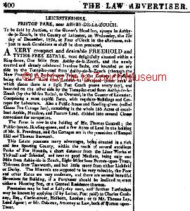Sale notice for Prestop Park estate on December 22nd 1824. Also a public house and Bowling green (called Goose Pen Cottage Inn).