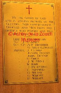 A 1914-18 War memorial plaque which used to be in the old St. Hilda's church, Moira. Now located in "Replan" - the old Council Office. pictured in 2014