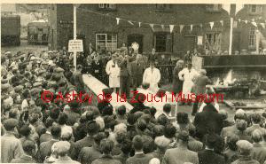 Ox roasting to celebrate the coronation of Elizabeth II June 1953. Baptist church in background. Third photo is the procession marching down Market Street. Possibly Inspector Cyril Blundy at head of procession.