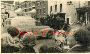 Celebrations for the coronation of Elizabeth II, June 1953. First photo showing assembling of parade in Hood Park. Second, shows closure of Market Street in place ready for procession. Third photo is the corner of Bath Street/Kilwardby Street (Lloyds Bank just visible on right on the corner). The van belongs to Patricks Electrical.