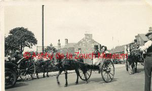 A gathering of probably the Matthews family prior to going to watch the procession to celebrate the coronation of George VI 1937. Processing from exit of North Street on to the top of Market Street.re shows "Miss Ashby" and attendants outside the Royal Hotel.